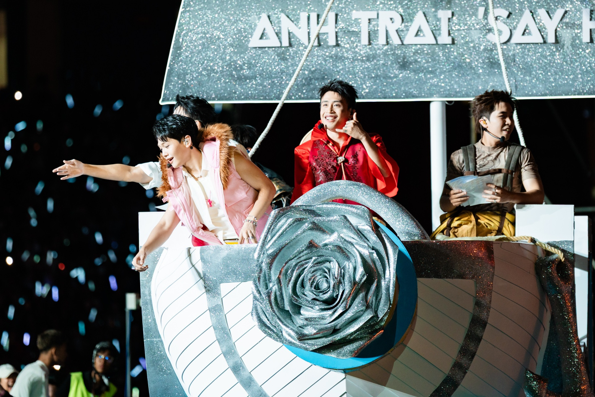 buitruonglinh, Bùi Duy Ngọc, Thái Ngân, Sơn.K, CONGB, Jey B mở màn đêm diễn với liên khúc Khát vọng là người Việt, Còn gì đẹp hơn. Tiếp nối chương trình là các tiết mục Chill guys ngon zai, Độc nhất vô nhị, Người yêu chưa sinh ra. Dàn “anh trai” xuất hiện trên xe mui trần được trang trí hoa trắng và ruy băng, tung hoa cưới xuống khán đài.